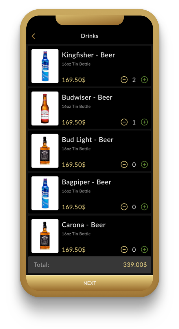 A focus on dark theme was selected to resonate a club or night event with a mixture of gold to indicate a luxury experience though the platform (or maybe because we love beer).